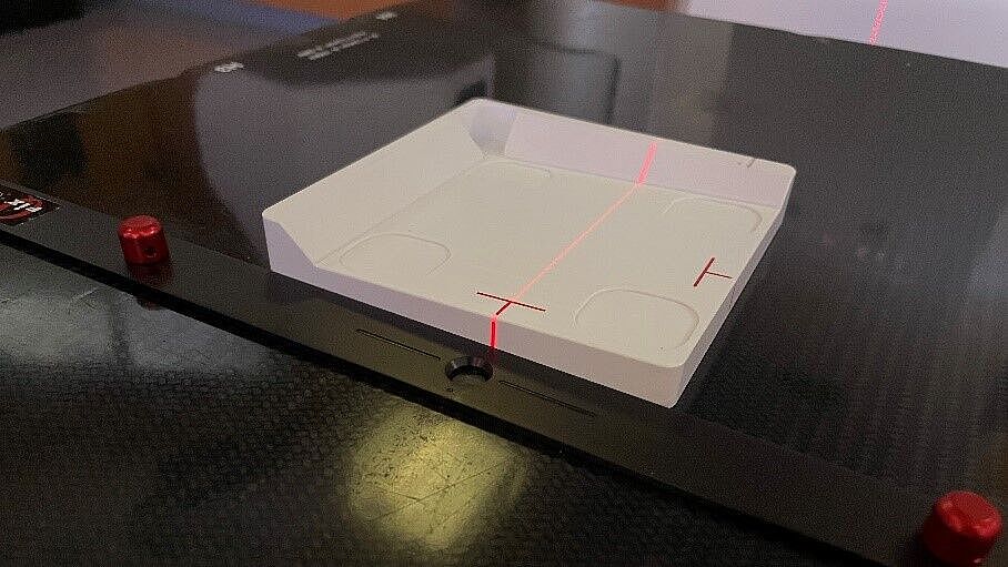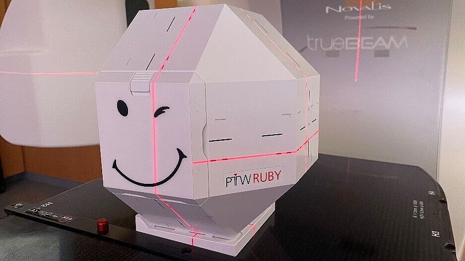 • Position RUBY base phantom with Linac QA insert (type number PTW T40072.1.200) on the tilting base and align the laser / the couch to the red line of the phantom